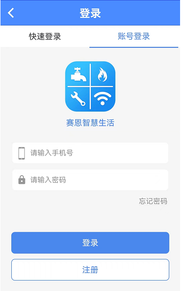 打開智慧生活APP,可以以“快速登錄”或“賬號登錄”兩種方式登錄。“快速登錄”需要輸入手機號、獲取驗證碼之后,輸入驗證碼直接登錄。“賬號登錄”需要輸入已注冊的手機號以及密碼進行登錄。如圖