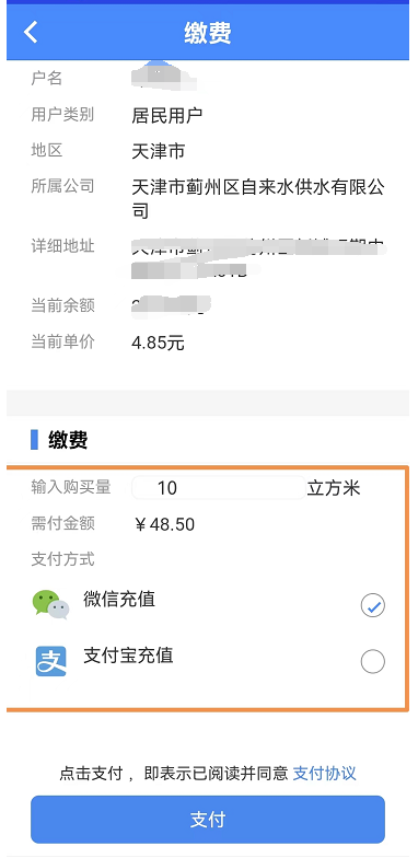 在繳費之前請核對表具信息輸入購買噸數(shù),支付方式支持微信和支付寶兩種方式。選擇輸入完畢之后點擊支付。如圖