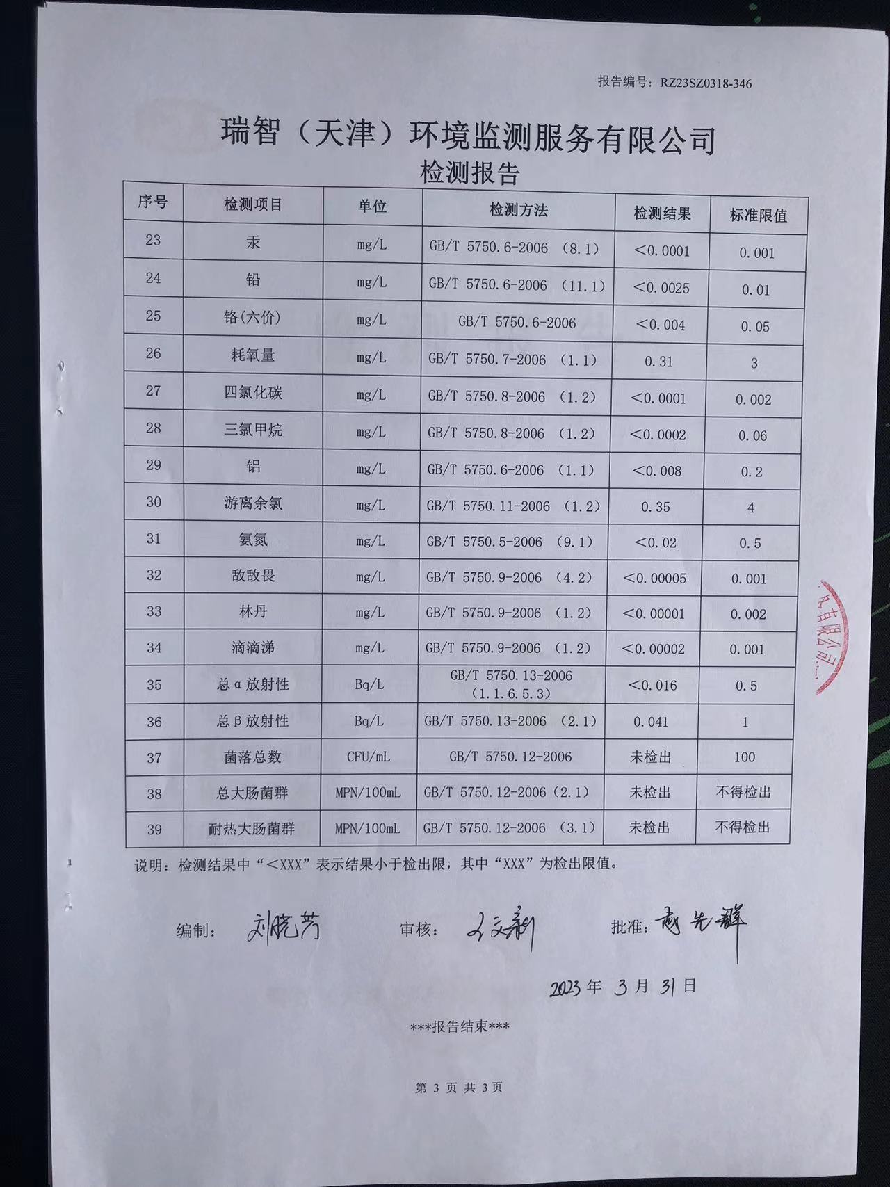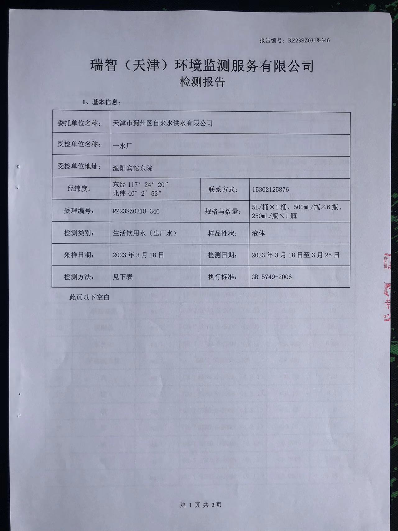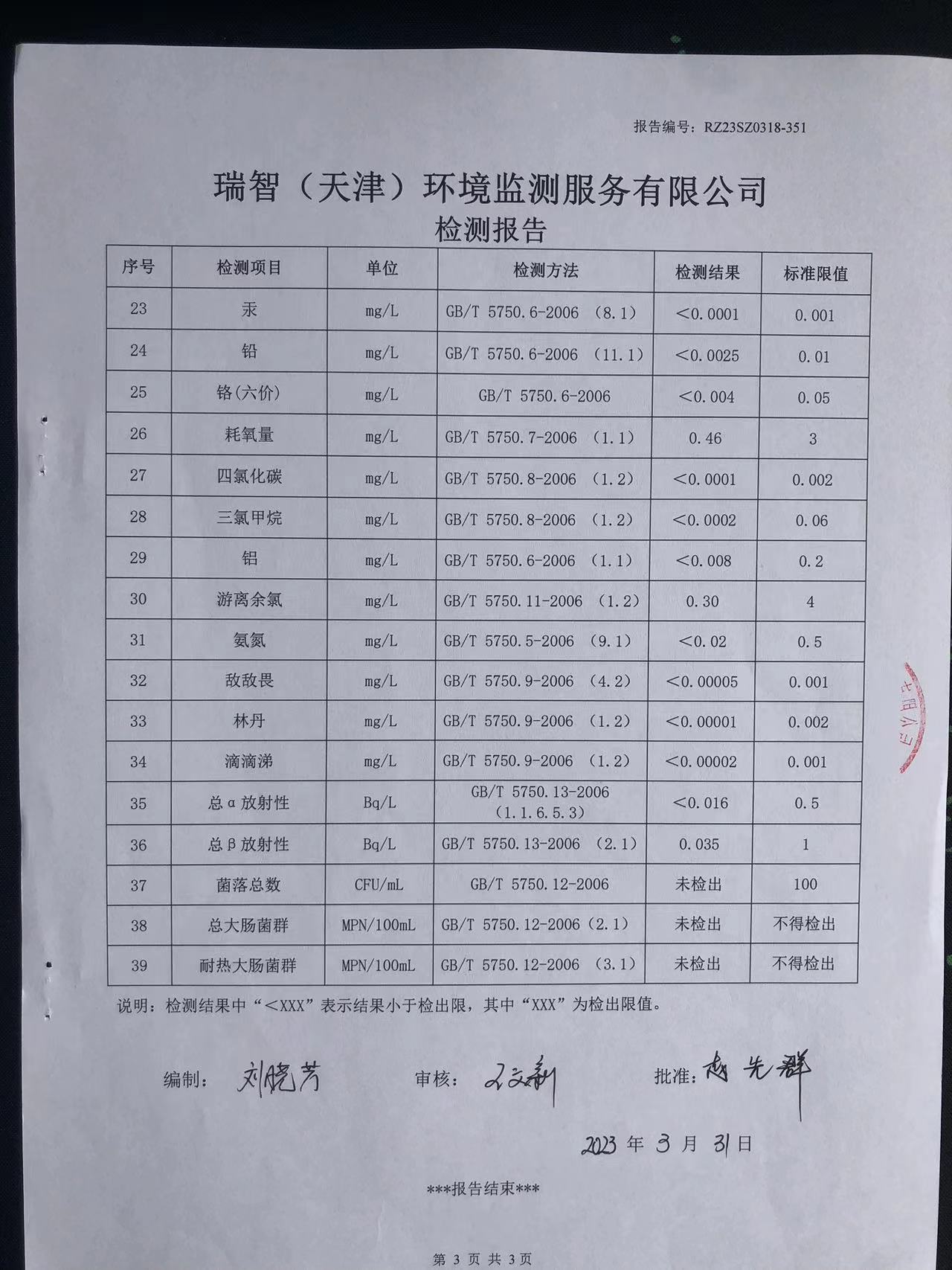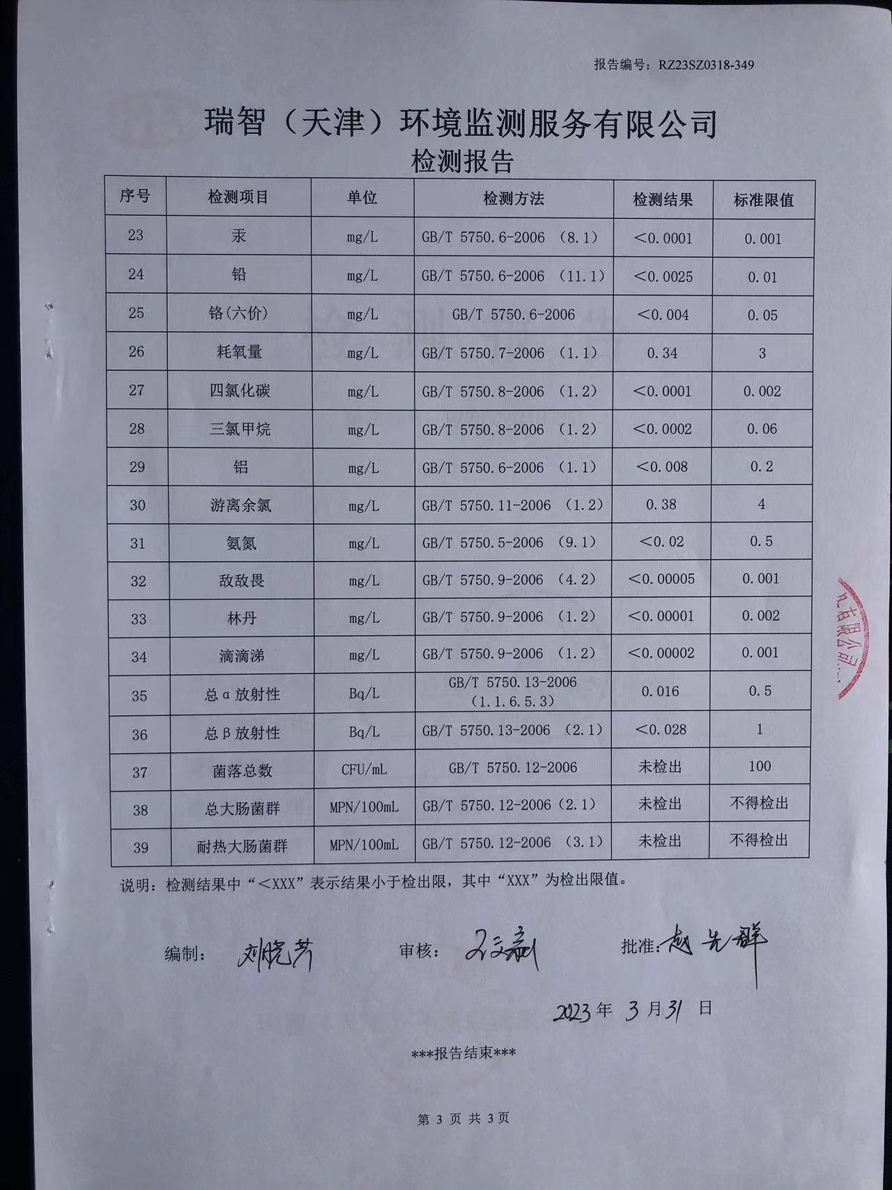 2023年3月份水質(zhì)檢測報(bào)告