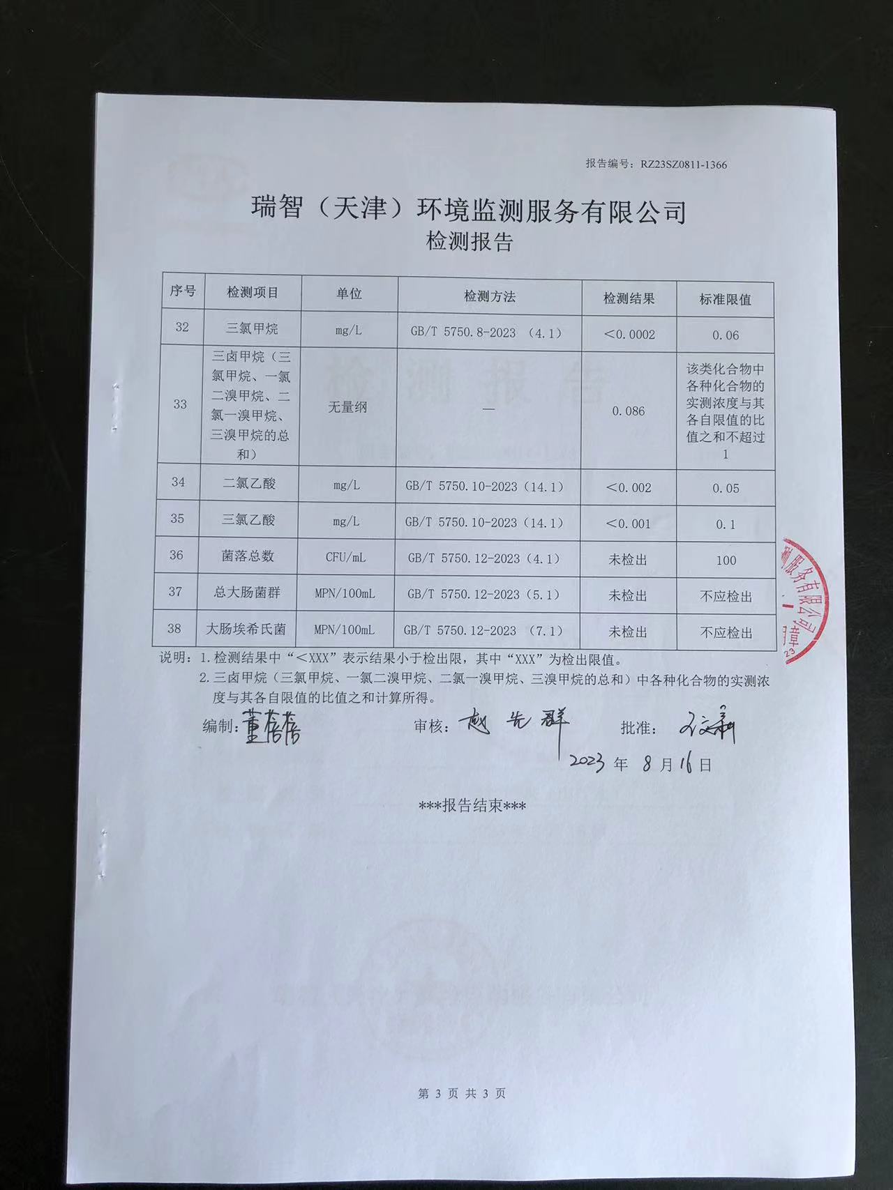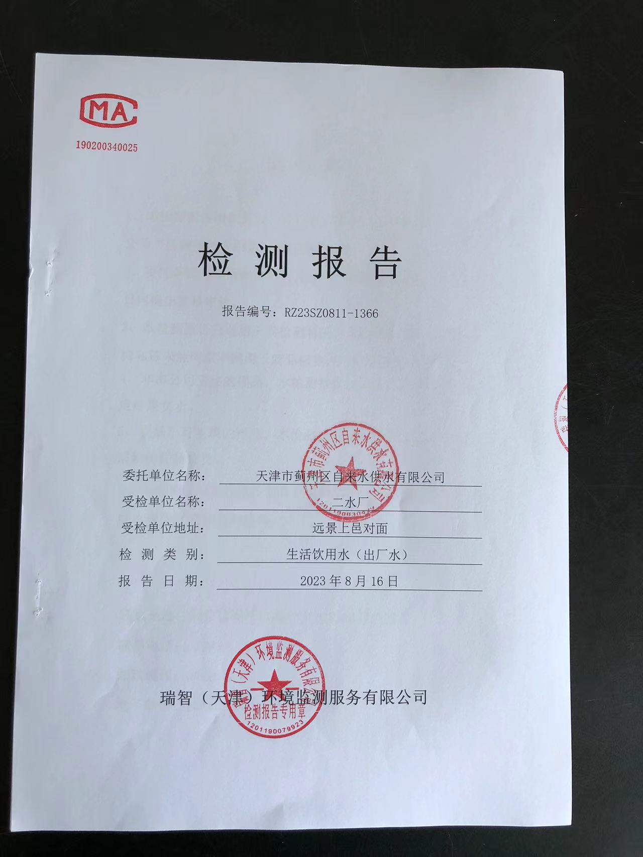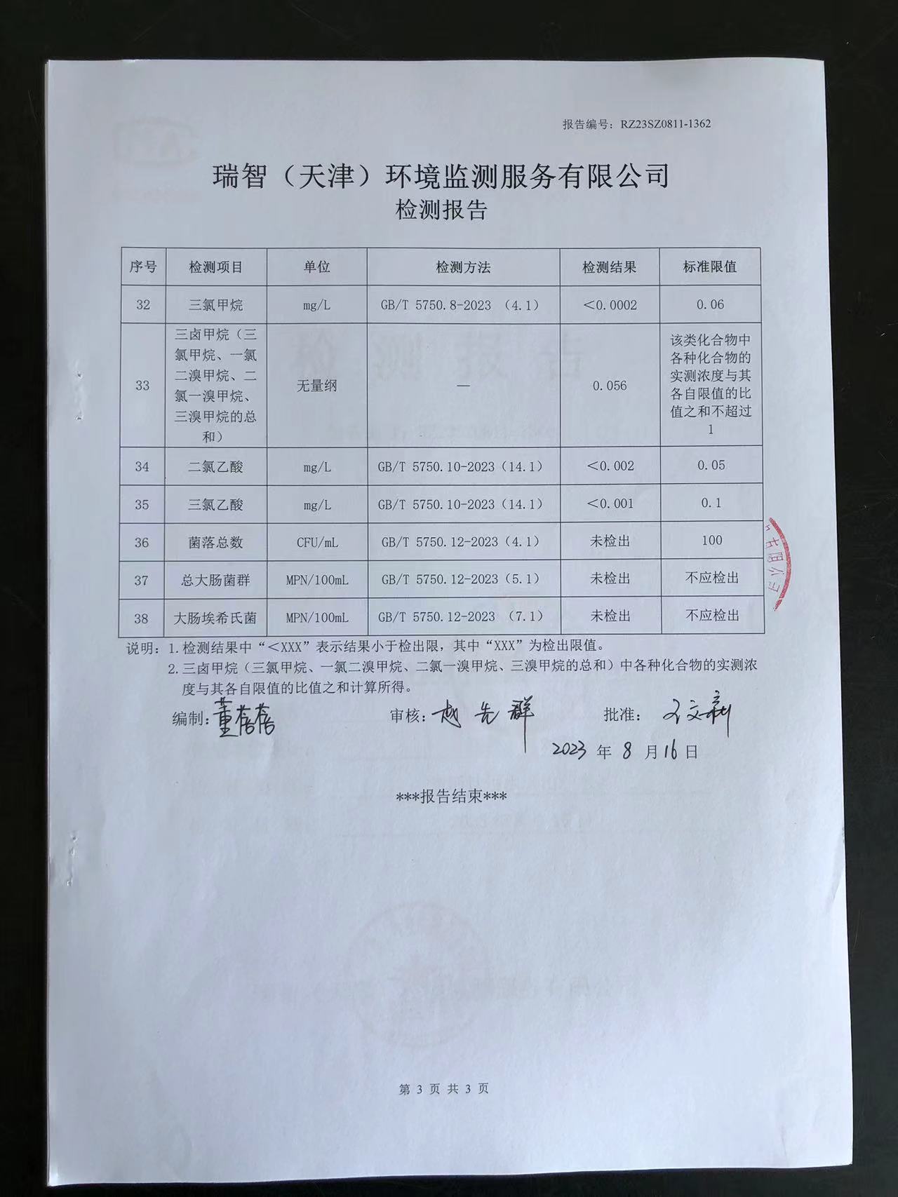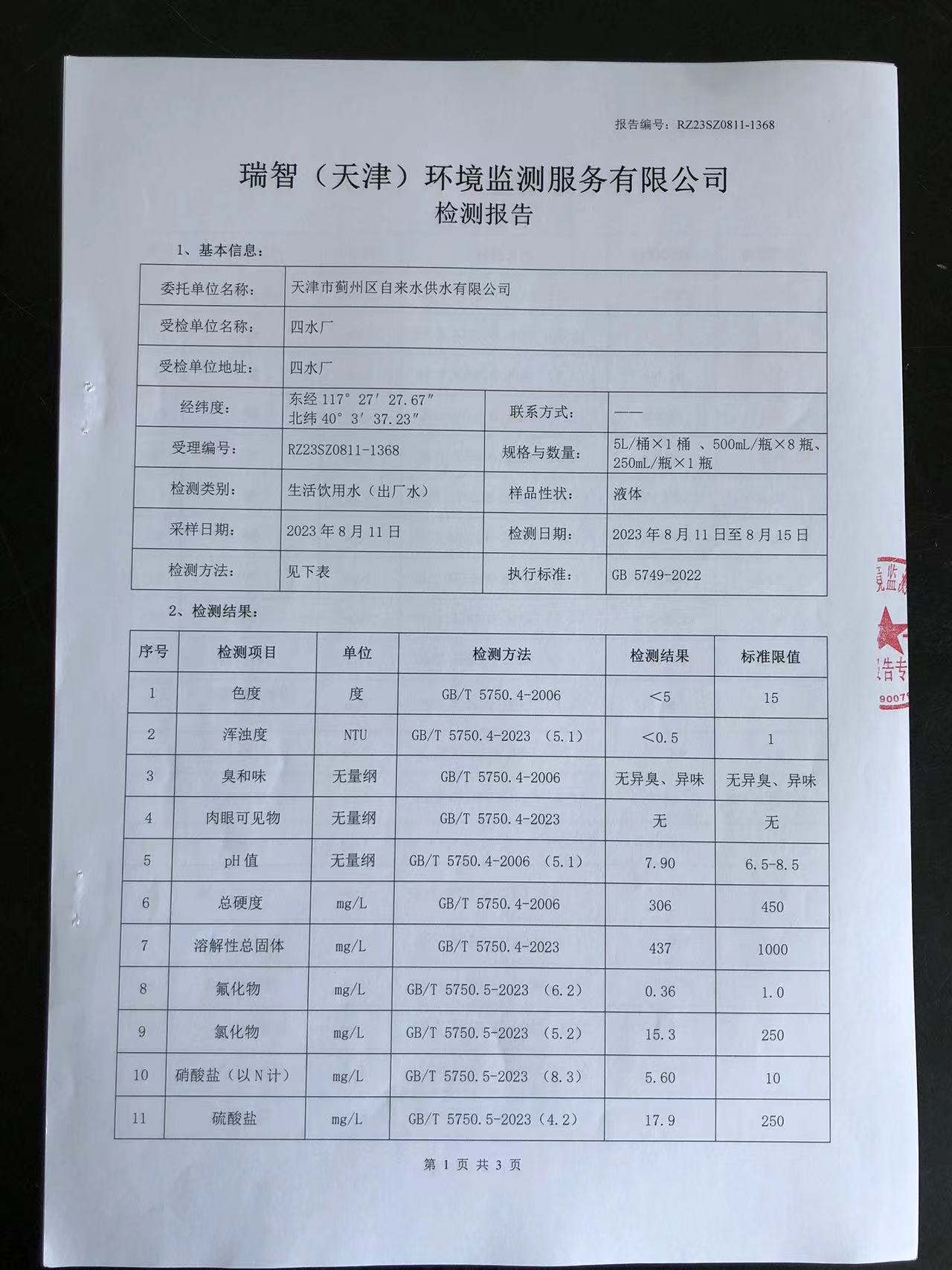 2023年8月份水質(zhì)檢測報告