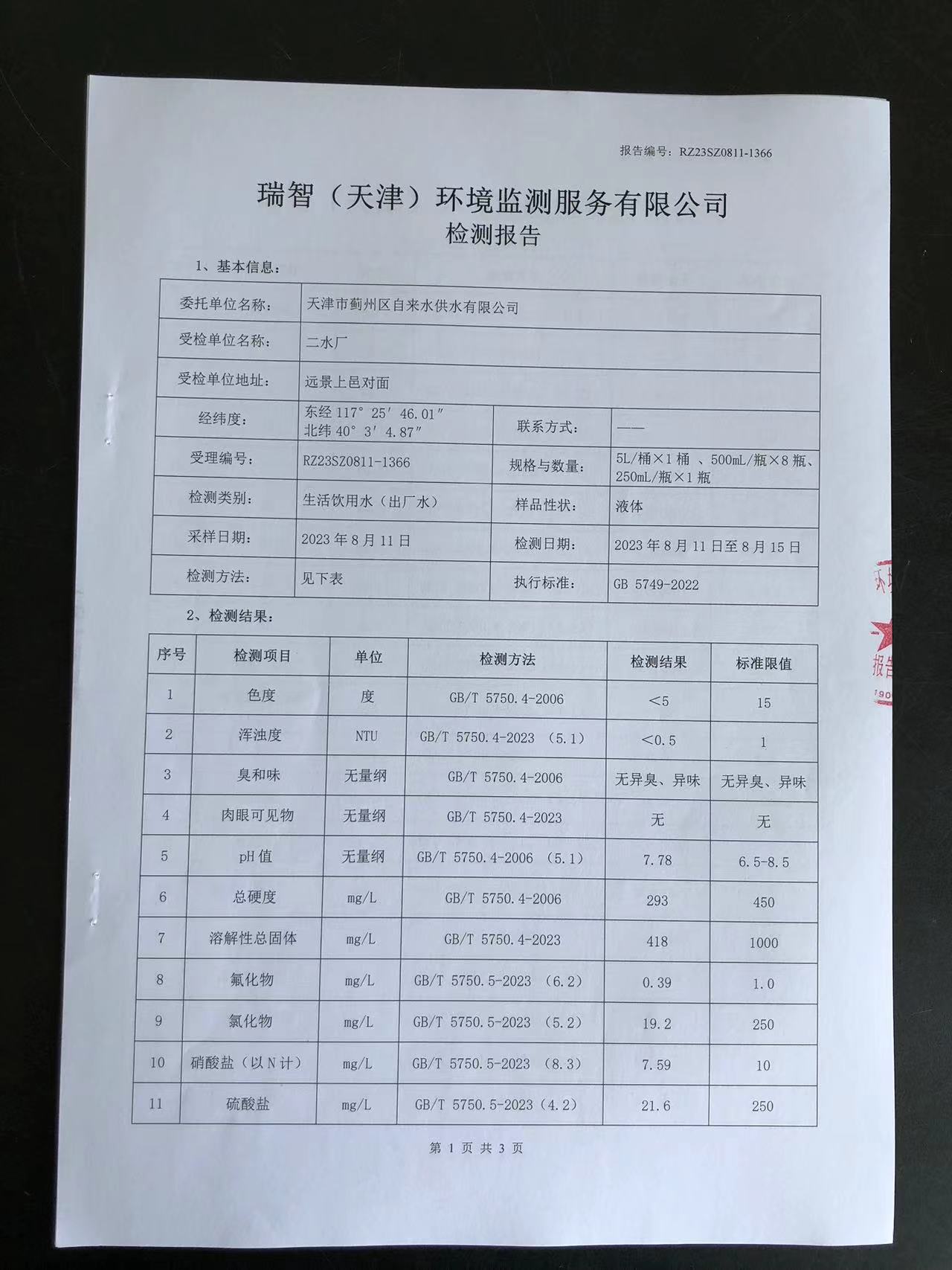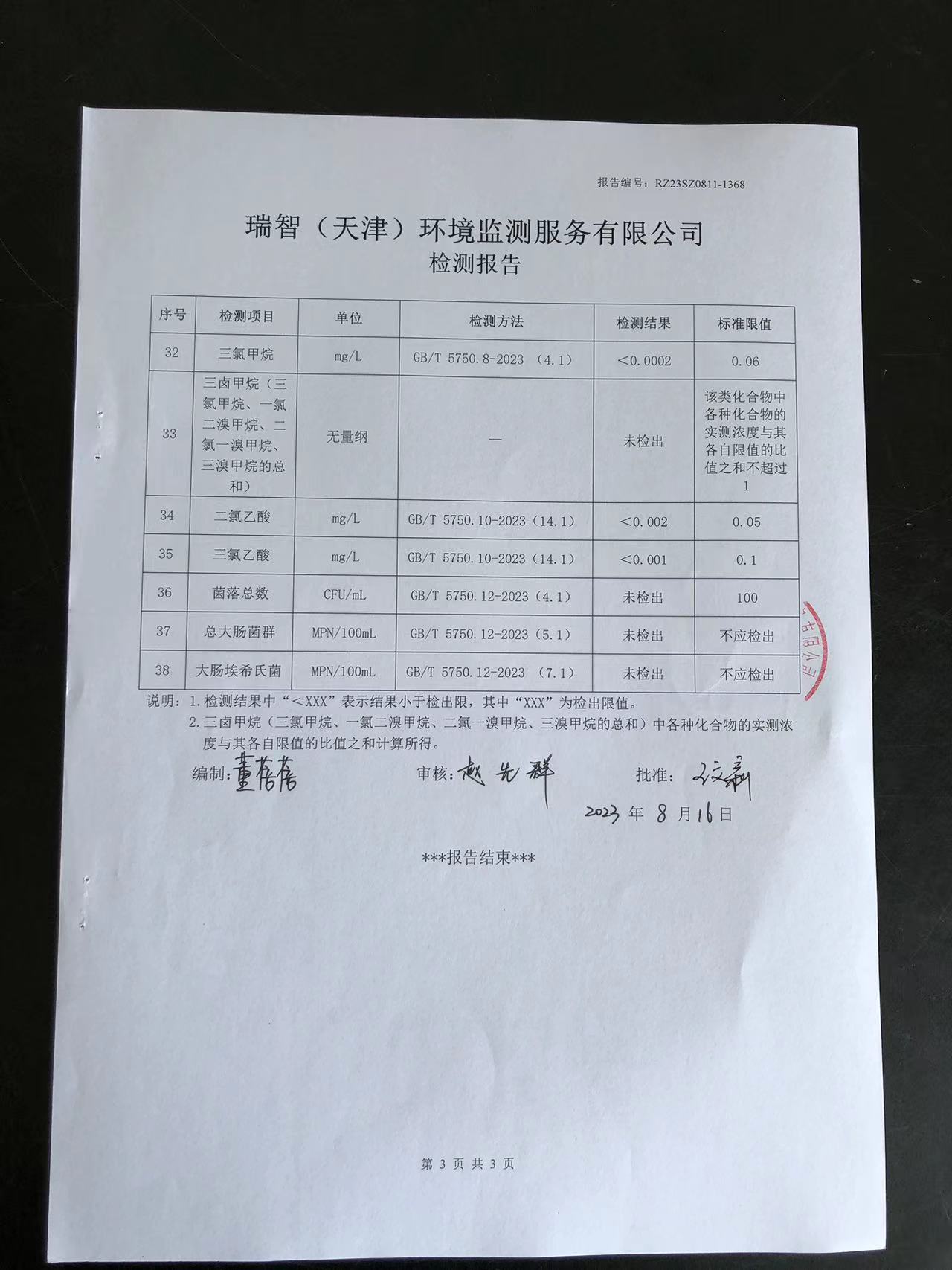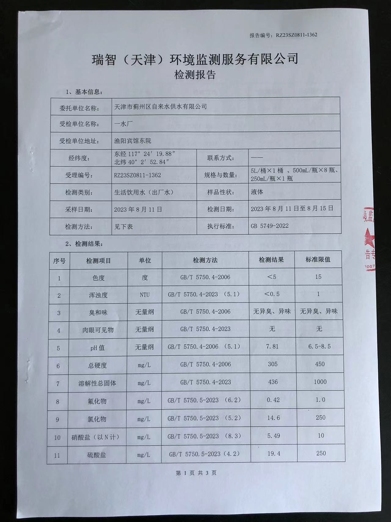 2023年8月份水質(zhì)檢測報告