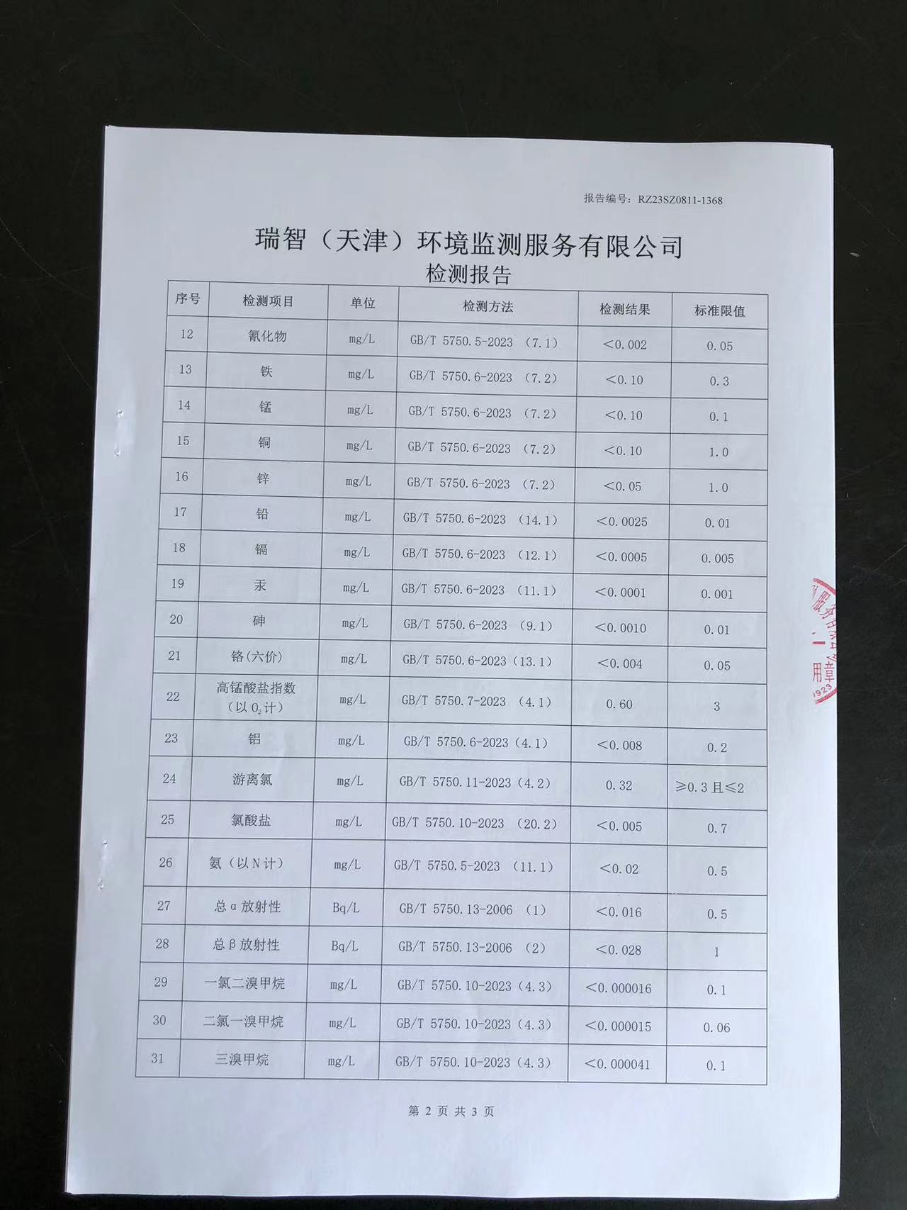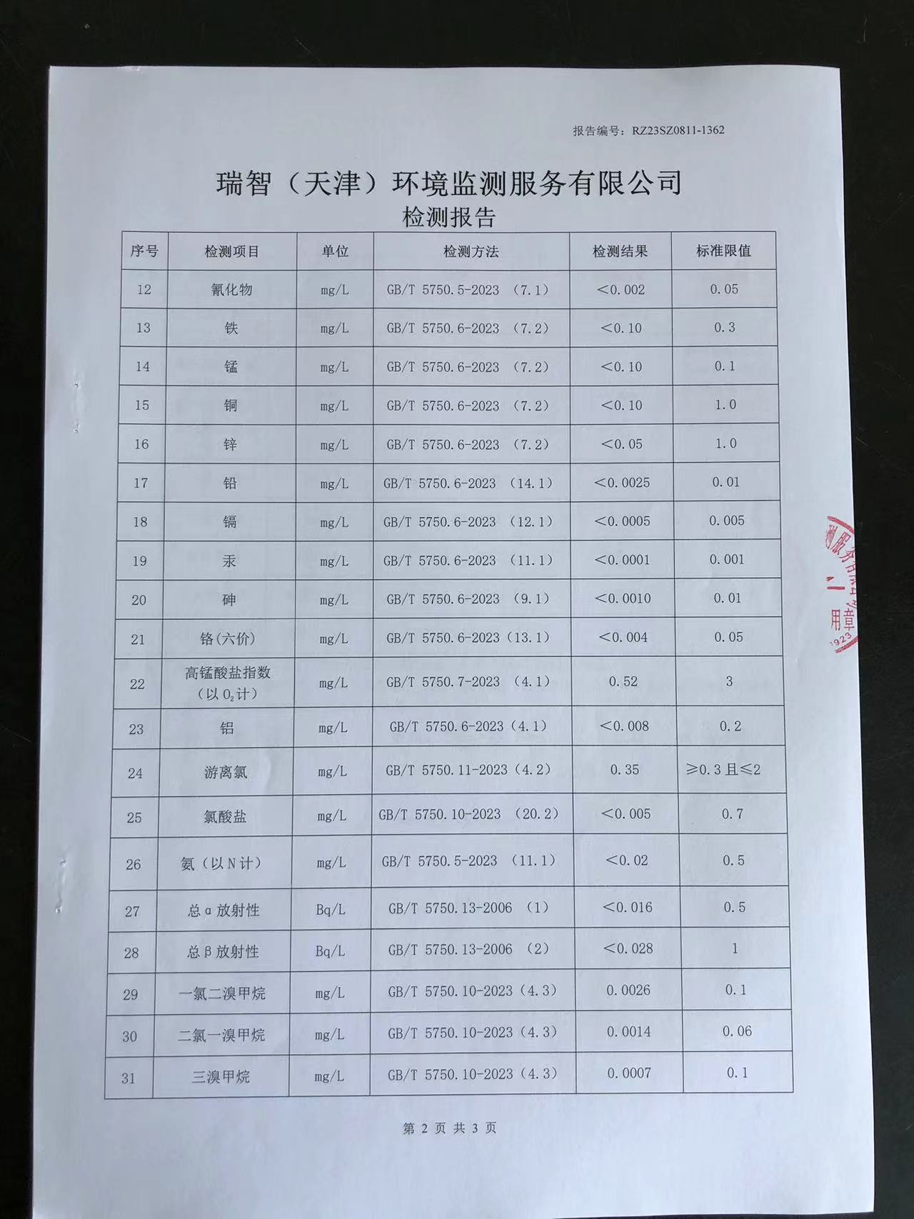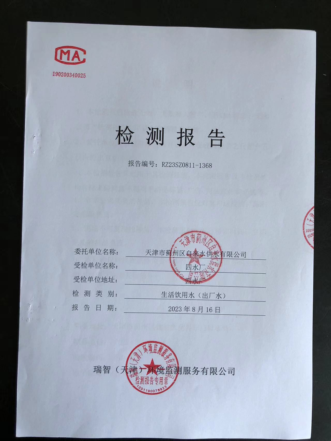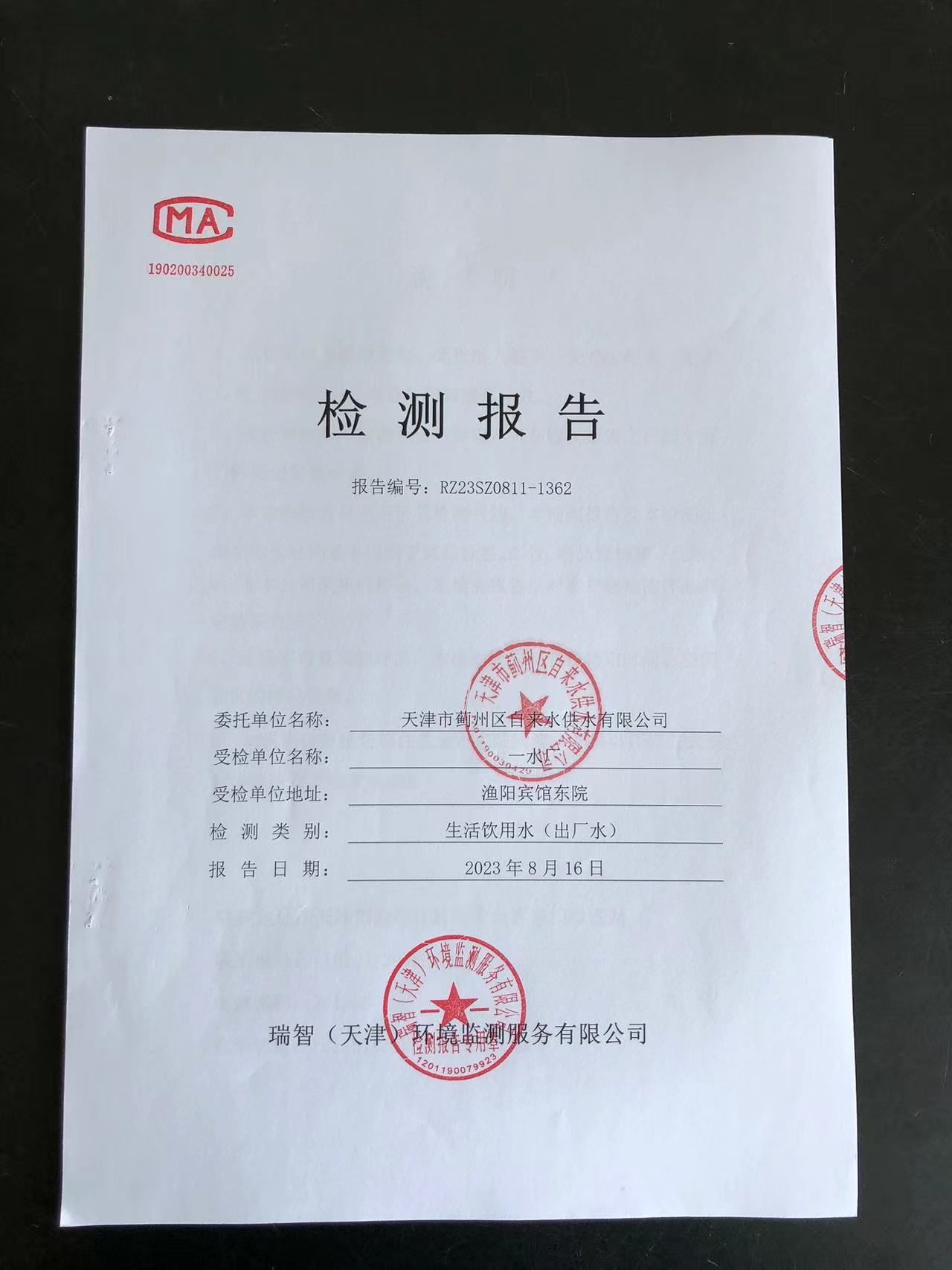 2023年8月份水質(zhì)檢測報告