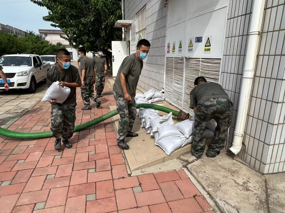 上圖為防汛搶險(xiǎn)隊(duì)用沙袋搭建圍堰并鋪設(shè)排水管道